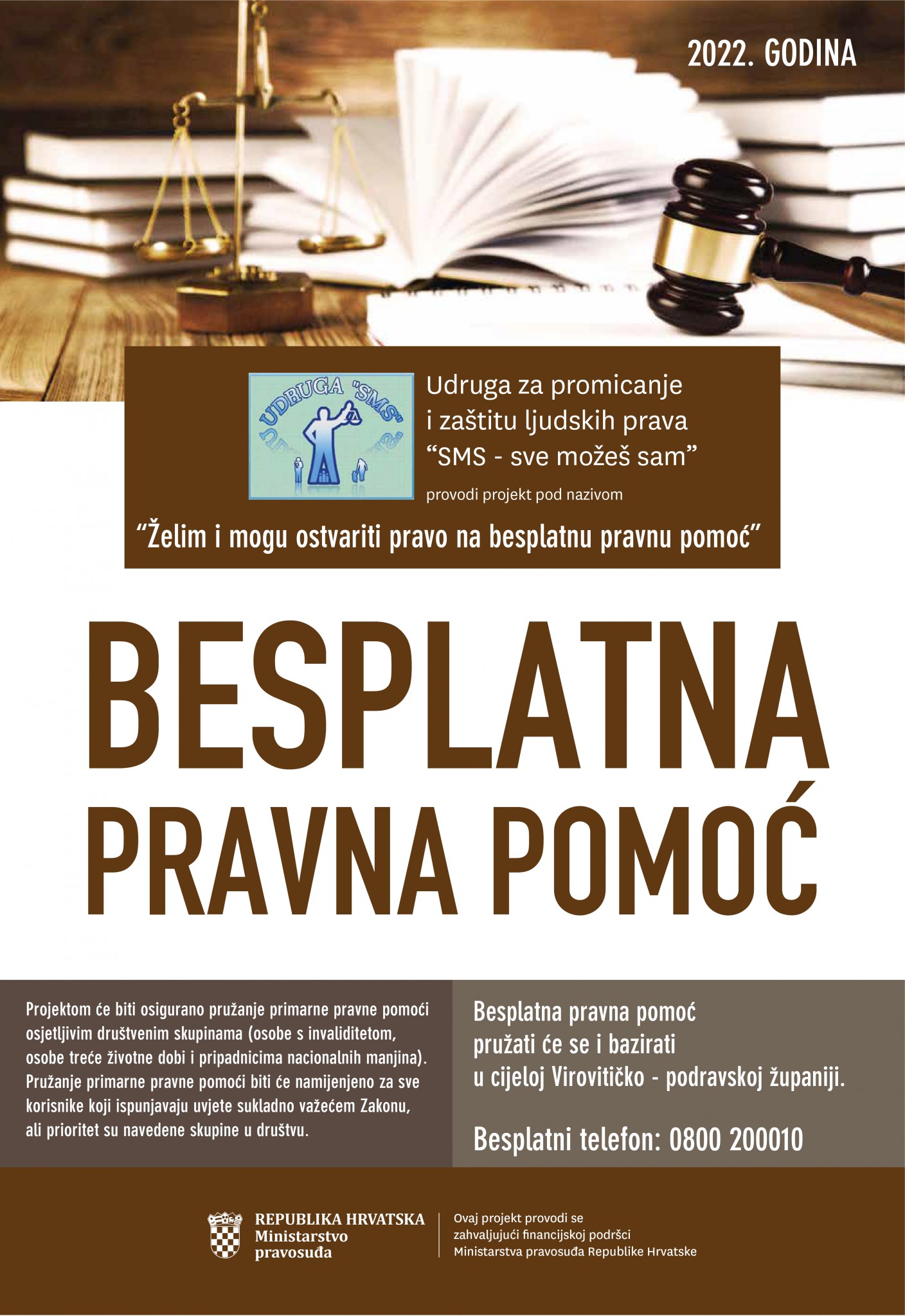 Udruga za promicanje i zaštitu ljudskih prava “SMS – sve možeš sam” provodi Projekt pružanja besplatne pravne pomoći pod nazivom “Želim i mogu ostvariti pravo na besplatnu pravnu pomoć”. Projekt za opći cilj ima osiguranje i ostvarivanje primarne pravne pomoći građanima Republike Hrvatske i drugim osobama u skladu s odredbama Zakona o besplatnoj pravnoj pomoći („Narodne novine“ br. 143/13, 98/19). Cilj nam je razvijanje programa direktne pravne pomoći korisnicima usluga, koji se dugoročno želi razviti u organizirani program. Ovim Projektom osnažiti ćemo i svrhu pružanja pravne pomoći: ostvarivanje jednakosti svih pred zakonom, osiguranje građanima Republike Hrvatske i drugim osobama djelotvorno ostvarivanje pravne zaštite te pristup sudu i drugim javnopravnim tijelima pod jednakim uvjetima.
